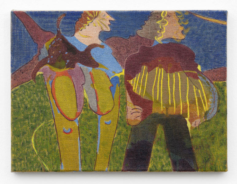 Diese Verspieltheit spiegelt sich gleichsam in der Wahl der Motive: Da gibt es etwa die Kleine Hexe mit erschöpfter Waldfee (2025), ein Motiv, das wiederholt in Schachingers Arbeiten zu finden ist und dessen widerständiges Potenzial, insbesondere innerhalb emanzipatorischer Diskurse, sich nicht von der Hand weisen lässt. Tanzen gehen (2025), Zehenspitzen (2025) und Vornüber (2025) suggerieren Leichtigkeit und unbekümmerte körperliche Bewegung, während andere Arbeiten wie Nasenspitzen (mit Fenja) (2025) oder Auf Augenhöhe (2025) Momente unbefangener Intimität und menschlicher Koexistenz zeigen. Auch das für die Schaffensperiode so zentrale ländliche Umfeld spiegelt sich, etwa im Falle von Wollmispeln (2023), in nahezu naturalistischen Darstellungen von Natur und Tieren, während Arbeiten wie Grind (2023) gänzlich gen Abstraktion streben und Schachingers Lust am Material und am Ausreizen der Grenzen ihres Mediums offenbaren.
