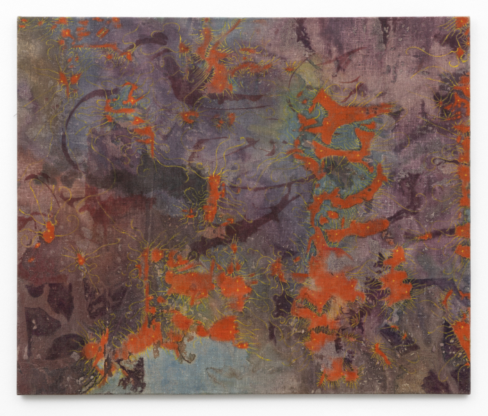 This liminal state, this in-between, hovers over the works like a leitmotif. They seem to shift effortlessly between abstraction and figuration, improvisation and intentionality, occasionally transcending the boundaries of their own frames and just as resolutely resisting clear categorization as they do binary logic or linear narration: The overlapping lines and planes of the paintings, whose partially glazed application of paint allows the underlying layers to show through or shine through, combine into ever-changing constellations, seem to be in a state of constant flux, and imply the simultaneity of different representations, as if they did not want to commit to a single image, a single truth. A sweeping, at times graphic or ornamental ink or brushstroke covers flat forms and backgrounds that do entirely without spatial perspective, and whose application of color always arises from a symbiosis with the materiality of the substrate. These are mostly textiles and garments from the artist’s personal use. Some of them already bear traces of color prior to their repurposing; others Schachinger stains with ink before stretching them onto the stretcher frame. Her artistic language thus always evolves from the process, the material itself, and her own enthusiasm for experimentation.