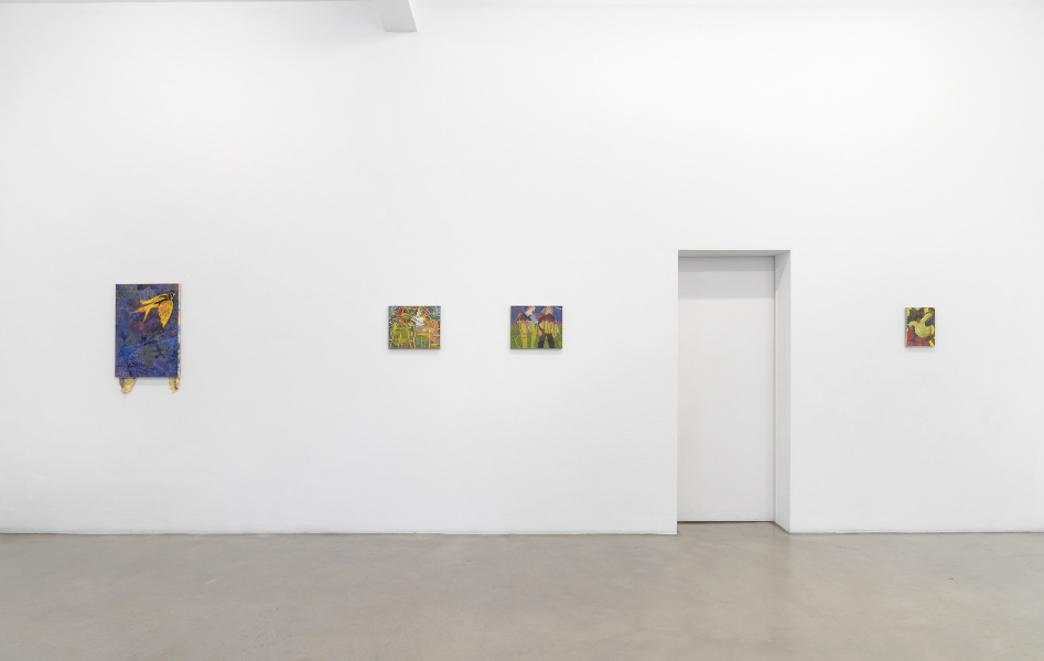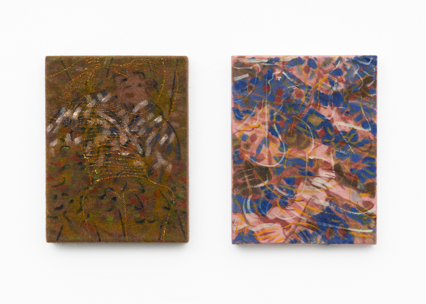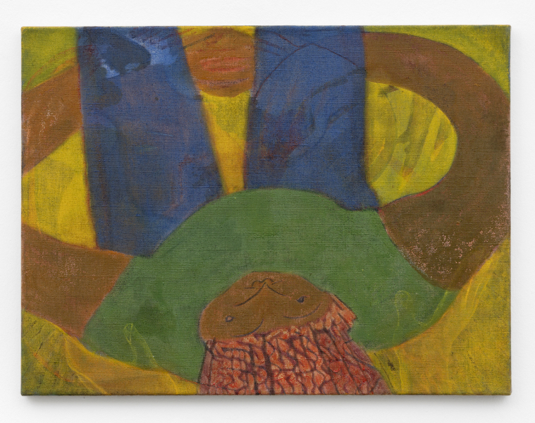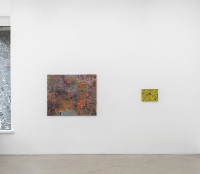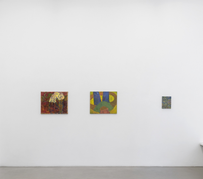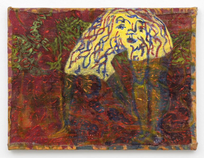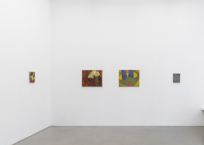 So much for freedom. Despite all the anarchy, however, Schachinger’s works never negate the context of their creation. The question of which materials are currently available, as well as the artist’s situatedness within her environment and society at large, directly influence form and motif. Decisions such as using fabric remnants from personal garments as a canvas and patching them together—should they not fully span the stretcher frame—which are sometimes made on a whim or out of pure pragmatism, subvert the auratic charge of the medium of painting. Given the history of feminist art, the choice of “precarious” materials from the domestic context cannot be entirely denied as having political implications beyond this formal deconstruction and democratization. However, reducing this decision to conceptual calculation would not do justice to Schachinger’s work: it does not appear strategic, but rather intuitive. Like a membrane—between inside and outside, past and present—the supports absorb their surroundings, entering into reaction and exchange. They mark not a boundary, but a connection. Their nature thus constantly refers to their own temporality and transience, lending the works an almost physical presence.