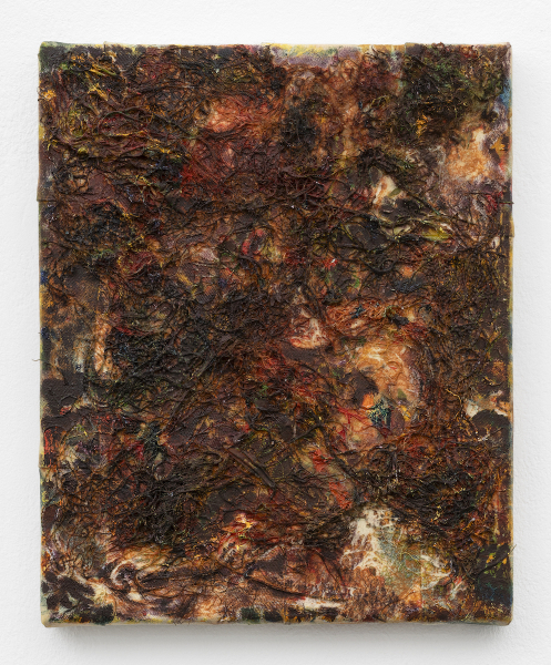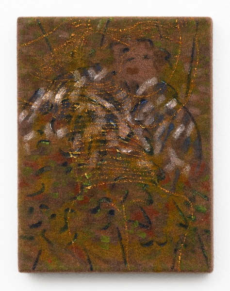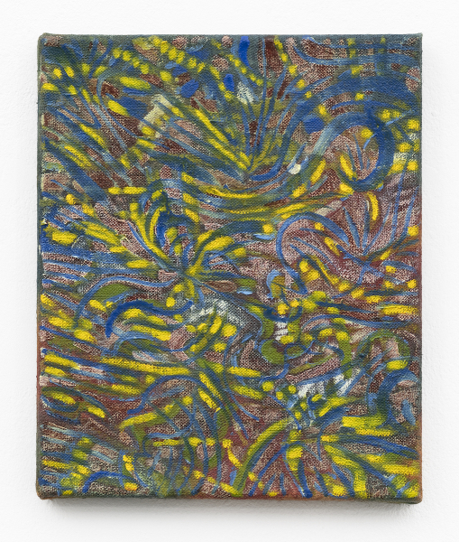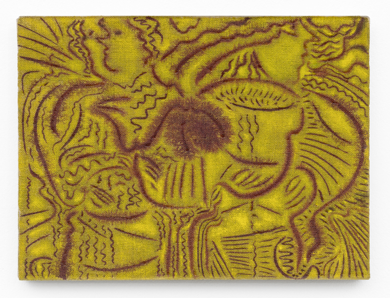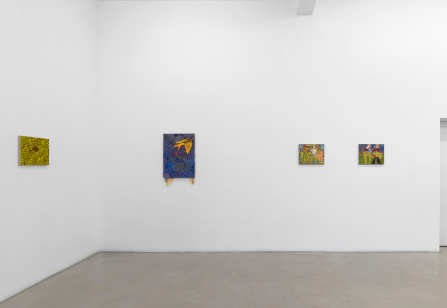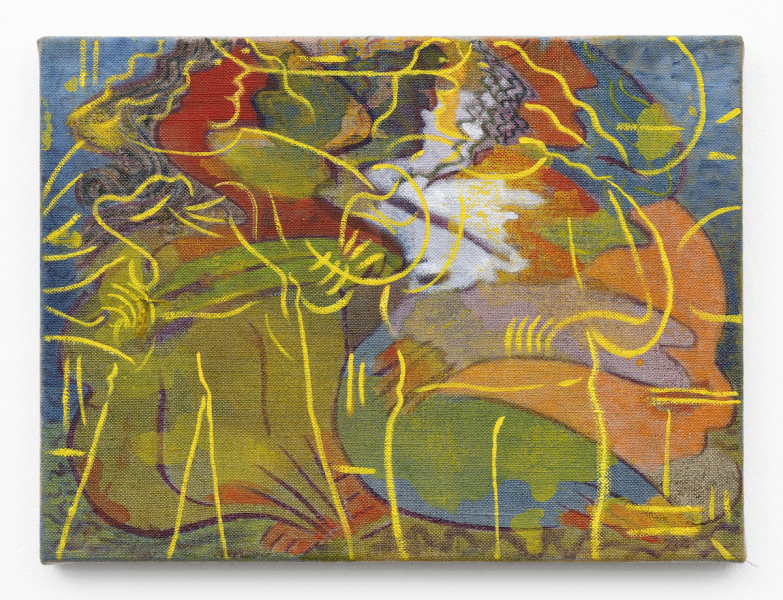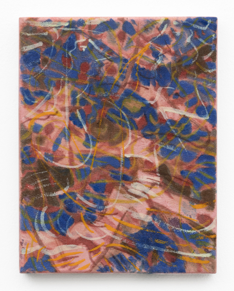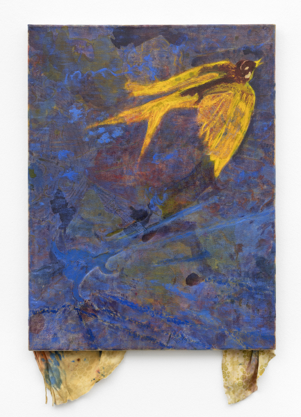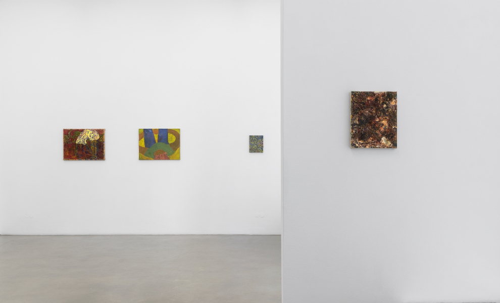 So much for freedom. Despite all the anarchy, however, Schachinger’s works never negate the context of their creation. The question of which materials are currently available, as well as the artist’s situatedness within her environment and society at large, directly influence form and motif. Decisions such as using fabric remnants from personal garments as a canvas and patching them together—should they not fully span the stretcher frame—which are sometimes made on a whim or out of pure pragmatism, subvert the auratic charge of the medium of painting. Given the history of feminist art, the choice of “precarious” materials from the domestic context cannot be entirely denied as having political implications beyond this formal deconstruction and democratization. However, reducing this decision to conceptual calculation would not do justice to Schachinger’s work: it does not appear strategic, but rather intuitive. Like a membrane—between inside and outside, past and present—the supports absorb their surroundings, entering into reaction and exchange. They mark not a boundary, but a connection. Their nature thus constantly refers to their own temporality and transience, lending the works an almost physical presence.