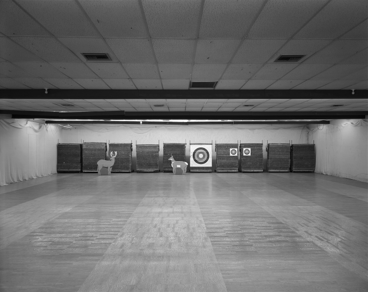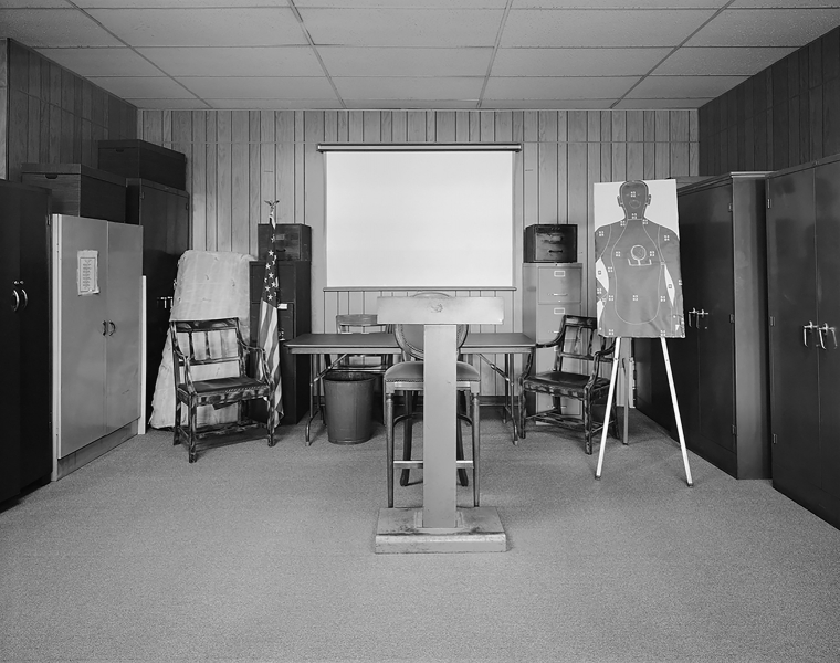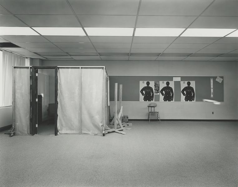 Trained as a sculpture and printmaker, Lynne Cohen started in the 1970s to focuse on the psychological and sociological artifice of the emerging North-American middle class. Using an 8 x 10-inch camera, she photographed living rooms, small stores, semi-public spaces such as men’s clubs, banquet halls, hotel lobbies, and offices. In the 1980s, Cohen went a step further and became interested in the mechanisms for controlling and manipulating society. She began to focus on more authoritarian institutions such as laboratories, police and military training centers, classrooms, and shooting ranges.