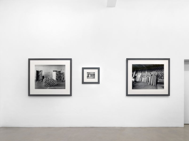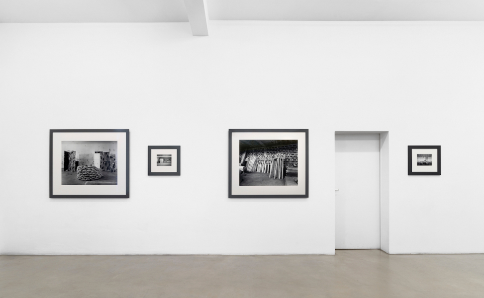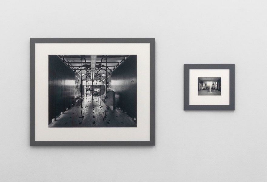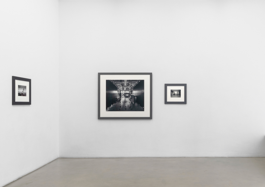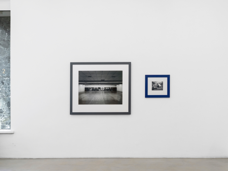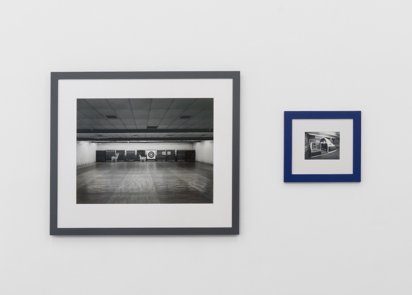 “Play at Your Own” is the title of the exhibition by US-American-Canadian artist Lynne Cohen (1944–2014). The b/w photographs, taken between 1977 and 1991, show deserted rooms. Nothing is staged. The artist photographed the rooms as she found them: a collection of cardboard dummies for shooting practice in a military facility, neatly sorted by size; the cabin of a Hercules bomber, reconstructed in a military training center; a shooting range with animal dummies; sacks piled up in a paintball facility.